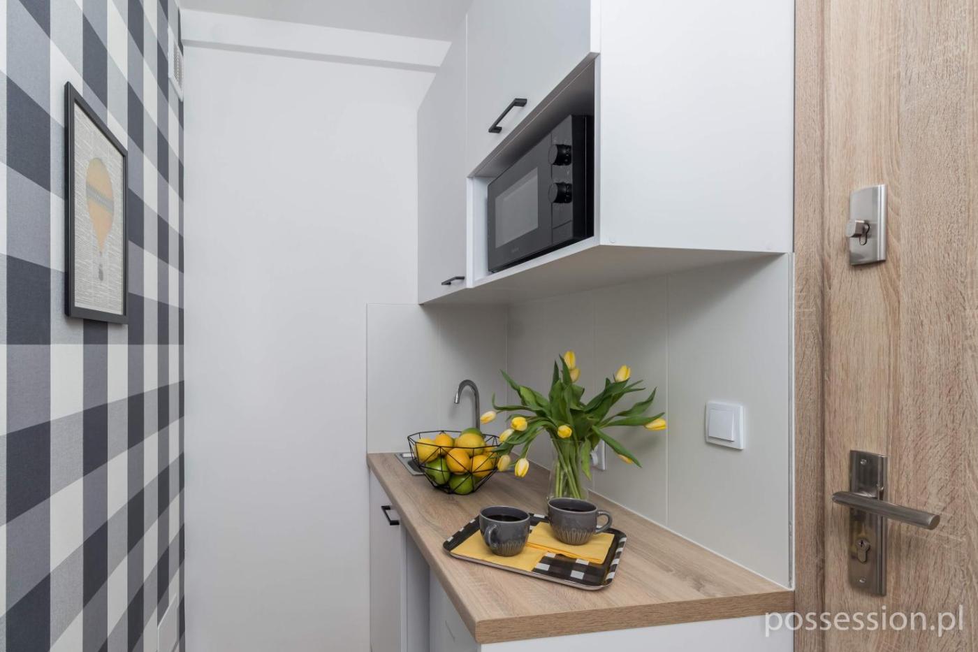 Studio. In the well-fitted kitchen, guests will find a stovetop, a refrigerator, kitchenware and an oven. The studio features a washing machine, a tea and coffee maker, a balcony with ancourtyard view as well as a private bathroom boasting a shower. The unit has 1 bed. Studio - 2 osobowy. Powierzchnia pokoju ok.: 15 mkw.