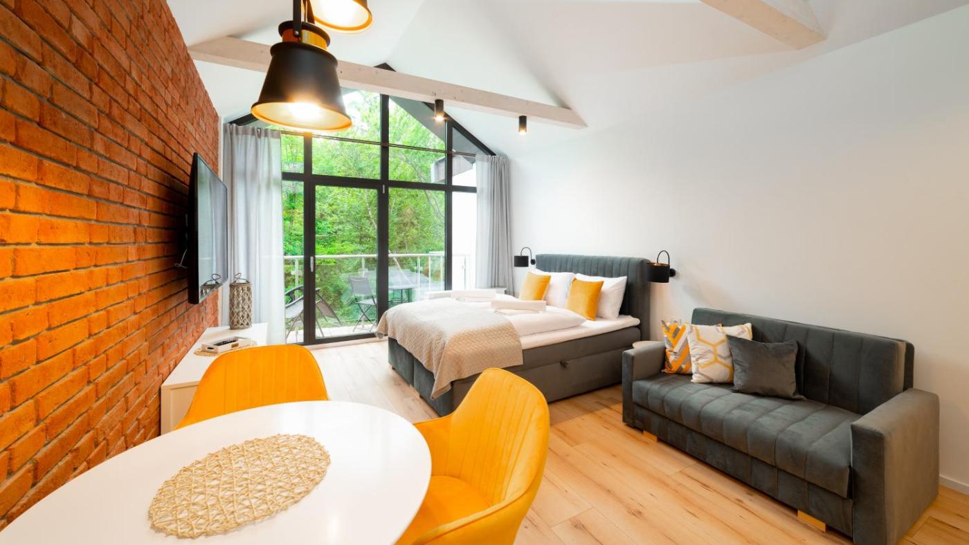 Studio z balkonem. The studio features a coffee machine, a dining area, as well as a private bathroom boasting a shower and a hairdryer. In the fully equipped kitchenette, guests will find a stovetop, a refrigerator, a dishwasher and kitchenware. Featuring a balcony, this studio also offers a wardrobe, heating and a flat-screen TV. The unit has 2 beds. Studio - 4 osobowy. Powierzchnia pokoju ok.: 28 mkw.